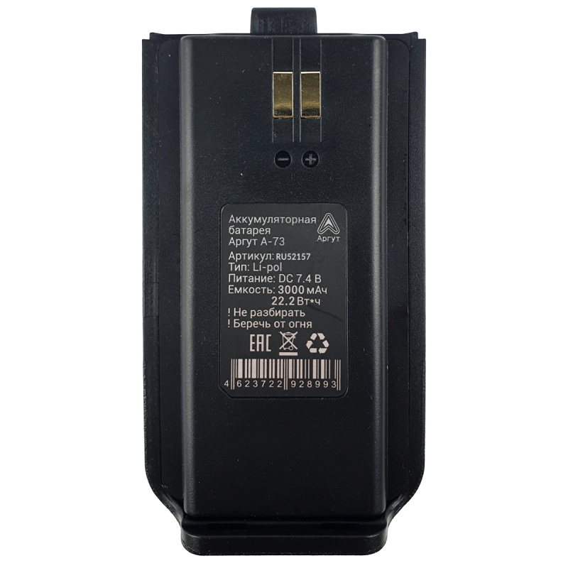 Аргут BAT-73 - аккумулятор увеличенной ёмкости 3000 мАч для одноименной рации модели А-73. Имеет разъем питания USB-C с защитной крышкой от пыли. Процесс зарядки можно контролировать по световой индикации. Стоит отметить литий-полимерный химический тип батареи. Характерными чертами такого элемента питания являются малый саморазряд, невыраженный эффект памяти и широкий диапазон рабочих температур от -20 до +40 °С. АКБ подвержено естественной деградации. Li-Poly элементы со временем теряют свою ёмкость - около 20% за два года активного применения.