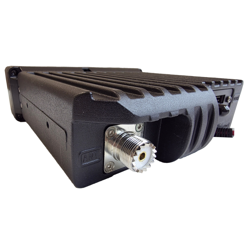 Приемопередатчик выполнен в металлическом корпусе и относится классу герметичности IP54. Лицевая панель изготовлена из пластика. На ней размещены органы управления и индикации, такие как: кнопка включения/выключения и навигации, экран, программируемые кнопки P1-P4, динамик, разъем для тангенты, переключения каналов, включения меню, возврата или отмены действия. На дисплее отображаются состояние работы устройства: уровень принимаемого сигнала (RSSI), мощность передатчика (высокая 20 Вт, низкая 5 Вт), индикация GPS, режимы работы (прямая связь, режим SFR, транкинг), непрочитанные сообщения и др. Радиостанция питается от источника постоянного тока (бортовой сети) номинальным напряжением 13,6 В и выходной мощностью не менее 200 Вт. Предусмотрен предохранитель в прилагаемом кабеле питания постоянного тока. Назначение сценариев функциональным клавишам, а также конфигурация рации производится при подключении к ПК. Понадобится кабель для программирования (приобретается дополнительно), USB драйвер и приложение по настройке. В комплект входит многофункциональный манипулятор с полноразмерной цифро-буквенной клавиатурой. Он может использоваться как для управления устройством, так и для набора частоты или текстовых сообщений.