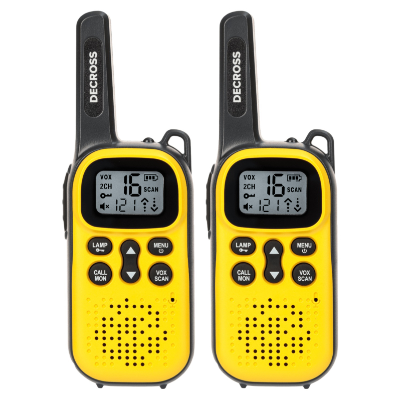 Decross DC43 Yellow Twin - комплект портативных радиостанций состоящий из двух единиц. Функционируют в частотном безлицензионном диапазоне PMR446. Рации имеют малый вес 86 г без АКБ, работают от трех батареек AAA и выполнены в ярком дизайне, что делает их привлекательными для юных пользователей. Могут применяться в походах и кемпингах. Разъем питания microUSB удобен в условиях отсутствия доступа к розеткам. Восполнить заряд можно в любой момент от внешнего аккумулятора. Также подходят для спортивных мероприятий и игр, например пейнтбол, страйкбол или велосипедные прогулки. Компактный размер 50×143×30 мм и крепление на ремень обеспечивают надежную фиксацию при активных движениях. Предусмотрена блокировка клавиатуры для предотвращения случайных нажатий. Встроенный LED-фонарик служит как дополнительный элемент развлечения или инструмент в условиях плохой видимости. Станции оснащены функцией VOX (голосовая активация). Она позволяет избежать абоненту нажатий на кнопку PTT для активации на передачу. Это полезно при выполнении задач, требующих свободных рук. Состояние работы устройств отображаются на экране. Выводятся такие индикаторы как уровень заряда аккумулятора, номер канала, мощность и активные функции, например, блокировка клавиатуры. Основные элементы управления отображены на рисунке ниже.
