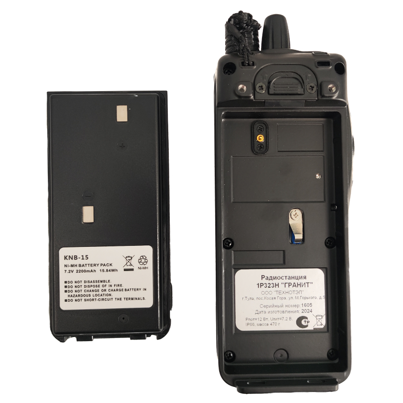 Радиостанция Гранит 1Р323Н, АКБ KNB-15, устройство для зарядки, антенна, сертификат РРР, руководство пользователя.