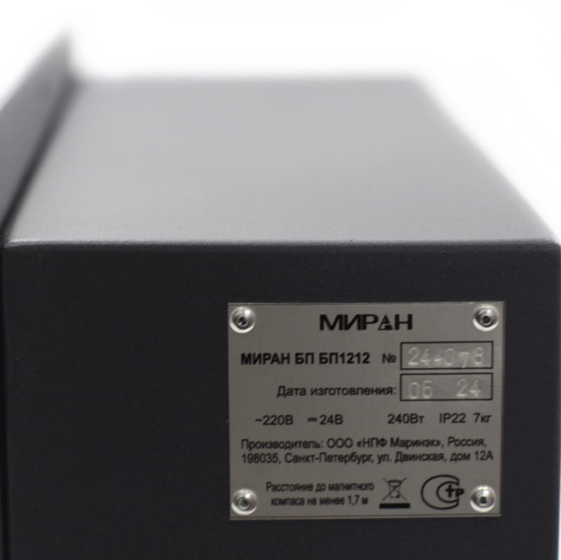 Миран БП1212 - стабилизированный источник питания для судового, навигационного и промышленного оборудования. Работает с двумя независимыми входными линиями, принимая как переменный ток 220 В, так и постоянный 24 В. Автоматическое переключение на резервное питание происходит при сбоях или отключениях основной электросети. Конструкция предусматривает встроенную защиту от переполюсовки резервной сети постоянного тока. Она снижает риски повреждения даже при ошибочном подключении, а также исключает возможность возникновения критических отказов в момент аварийного переключения источника питания. Устройство прошло типовое освидетельствование и сертифицировано Российским морским регистром судоходства (РМРС) и Российским речным регистром (РКО). Также имеет сертификат СТиС МВД РФ в составе системы охранного видеонаблюдения ТСОН МИРАН.