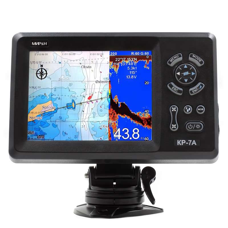 Миран КР-7А – картплоттер со встроенной системой АИС класса B. Автоматическая идентификационная система такого класса предназначена для неконвенционных бортов, т.е. судов с ограниченным районом плавания. Она автоматически транслирует в УКВ диапазоне информацию о судне и его перемещении. При помощи модулей ГНСС и картографии в непрерывном режиме осуществляет связь со спутниками для определения местоположения. Устройство оснащено эхолотом, поддерживающим до 16 цветов отображения уровней глубины. Его мощность до 600 Вт. Эта функция применяется как для профессиональных целей – сканирования дна для получения данных о рельефе, расстояния до него, так и для личных – вспомогательное оборудование для спортивной или любительской рыбалки.