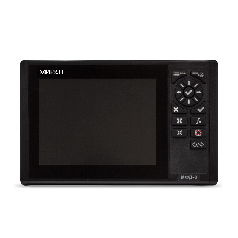 МИРАН МФД-8-07-1 – многофункциональный цветной дисплей, предназначенный для использования на маломерных судах. Отображает актуальную информацию навигационной системы, необходимой для судоводителя. Имеет компактное исполнение 187x288x79 мм и вес 2 кг. Диагональ 8” дюймов с разрешением 1024х768 пикселей. Предусмотрена интеграция нескольких МФД в единую группу для отображения емкого количества данных. Элементы управления в виде клавиш расположены справа от экрана. Порты подключения опциональных устройств и систем судна находятся на задней панели. В память изделия заложены всемирная базовая карта и данные о приливах и отливах по всему миру.