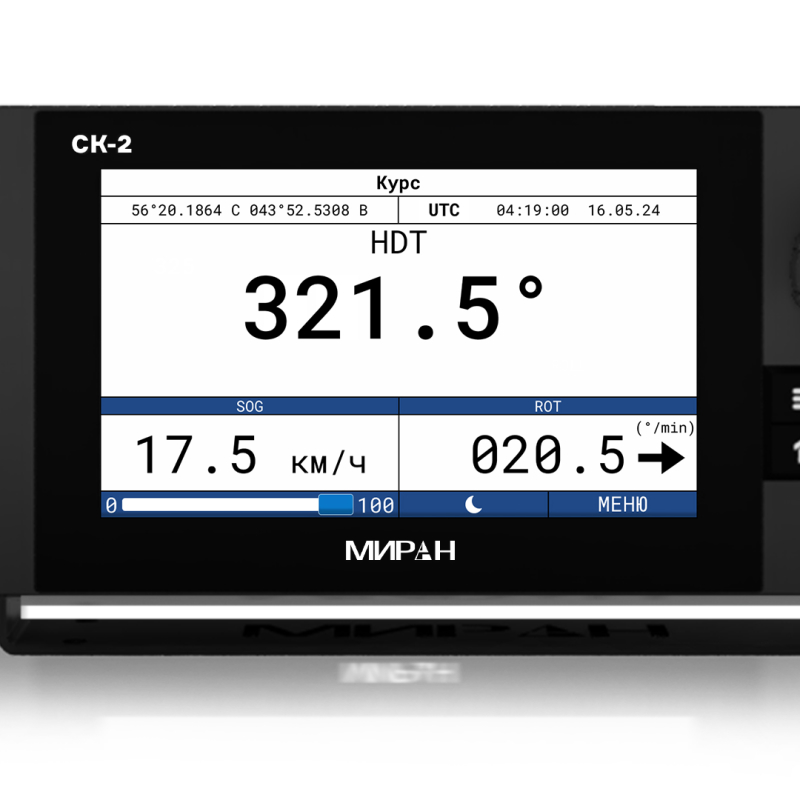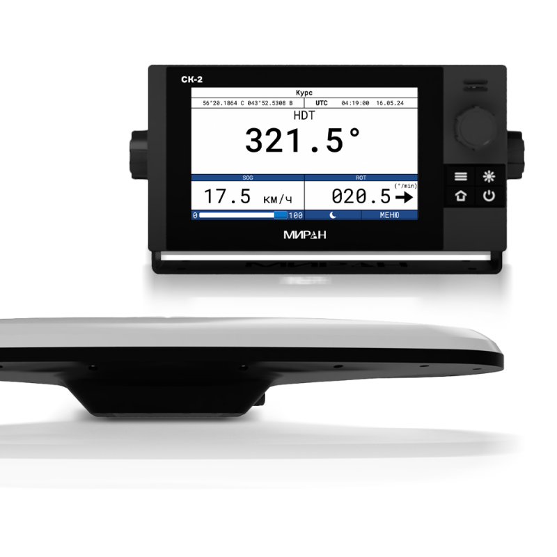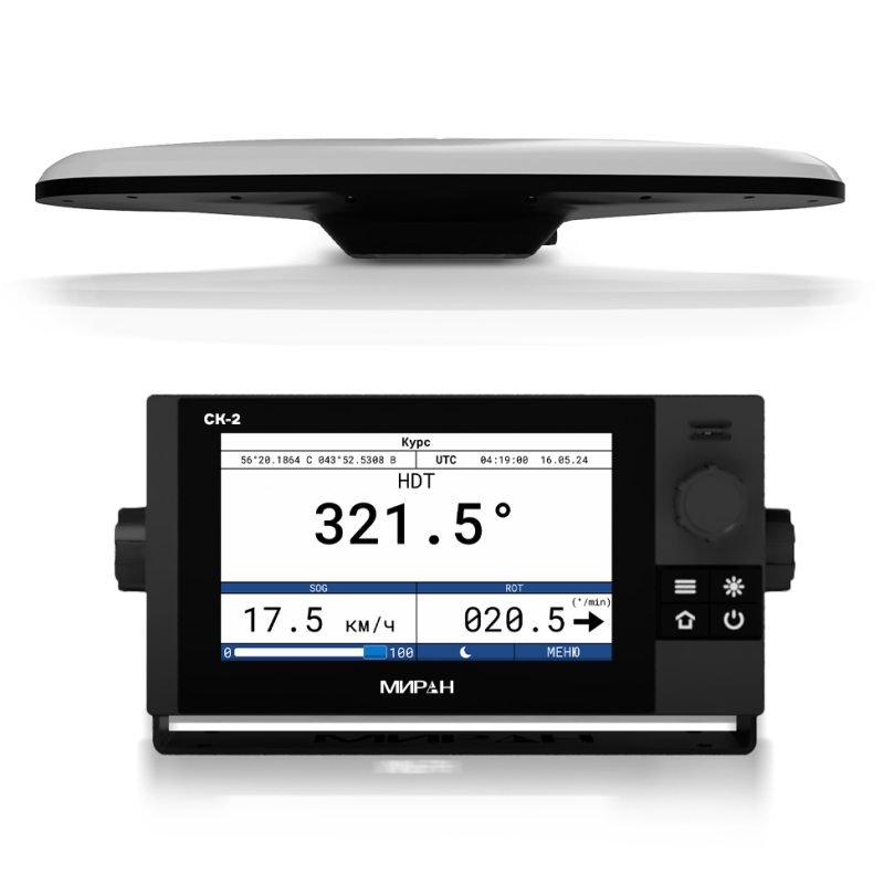 Миран СК-2 - спутниковый компас для точного определения курса и пространственной ориентации судна. Устройство состоит из двух ключевых компонентов: антенного блока АСК-76 и блока отображения и управления ДСК-7. Антенна АСК-76 является многосистемным высокочувствительным приемником, способным одновременно обрабатывать сигналы четырех глобальных навигационных спутниковых систем: GPS, Глонасс, BeiDou и Galileo. Работает с более чем 1100 каналами приема, что обеспечивает помехоустойчивость и доступность сигнала в сложных условиях. Корпус антенны рассчитан на эксплуатацию в диапазоне температур от -40 до +55°C и имеет степень защиты от влаги IP56. Блок ДСК-7 выполняет функции мощного вычислительного центра и удобного интерфейса для взаимодействия с экипажем. Он оснащен ярким 7-дюймовым цветным экраном с разрешением 1024х600 пикселей. Поддерживает русский и английский языки. Устройство отображает текущий курс, крен, дифферент и другие параметры. Для достижения максимальной точности и стабильности информация со спутниковых приемников объединяется с показаниями встроенных датчиков: гироскопа, акселерометров и датчиков наклона. Эта синтезированная система позволяет прибору мгновенно компенсировать бортовую и килевую качку, а также кратковременные потери спутникового сигнала, продолжая выдавать точные данные.
