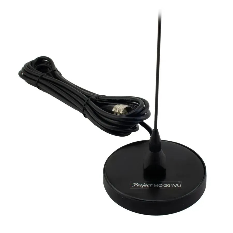 Project MS-201VU - штыревая антенна с магнитным основанием, ориентированная на работу в двух диапазонах: VHF и UHF. Имеет усиление 2.15 / 3.5 дБи. Для крепления к автотранспортному средству используется неодимовый магнит диаметром 90 мм. От его сцепления зависит не только удержание антенны на скорости, но и качество «земли». Для антенн с магнитным креплением роль противовеса выполняет металл кузова, и плотный электрический контакт через магнитное поле напрямую влияет на КСВ (коэффициент стоячей волны). Антенна комплектуется кабелем 4.5 метра, что достаточно для прокладки к передней панели автомобиля с запасом. Разъем на конце - стандартный PL259 (UHF-вилка).