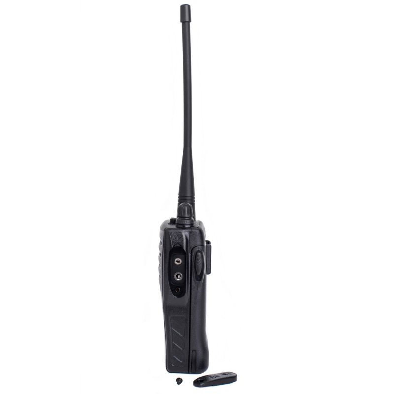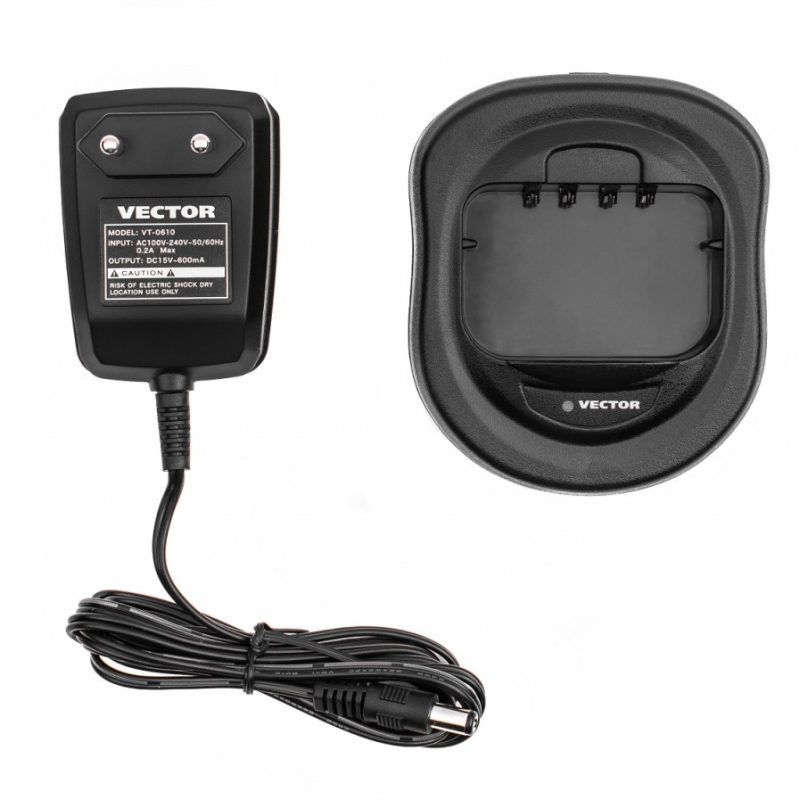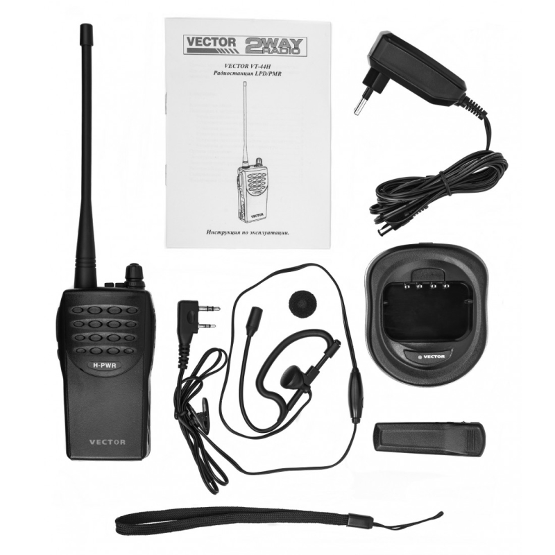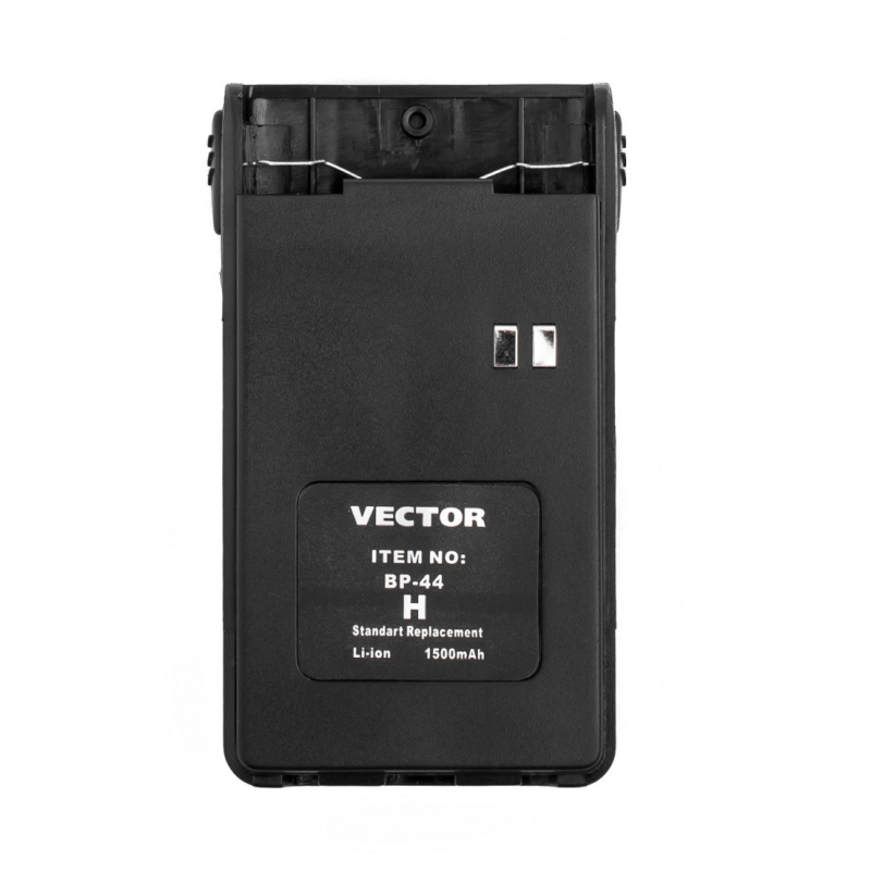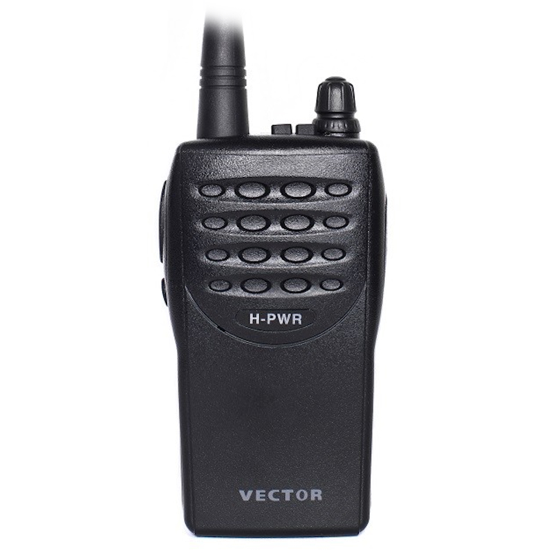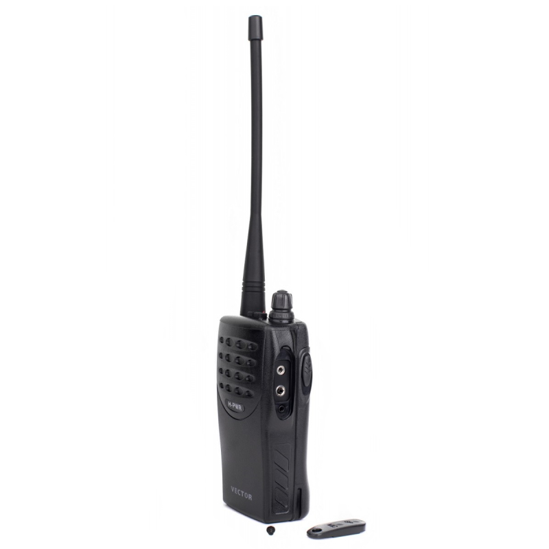 Vector VT-44 H #V – портативная рация диапазона VHF c отображением каналов на мини-экране в верхнем торце прибора. При ношении устройства на поясе видно, какой канал включен в данный момент. Там же расположены кнопки переключения каналов. Мощность передатчика - 5Вт. Емкость батареи - 1500 мАч. Прибор выполнен в прочном корпусе, который хорошо лежит в руке.
