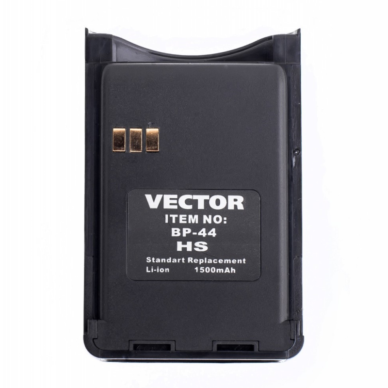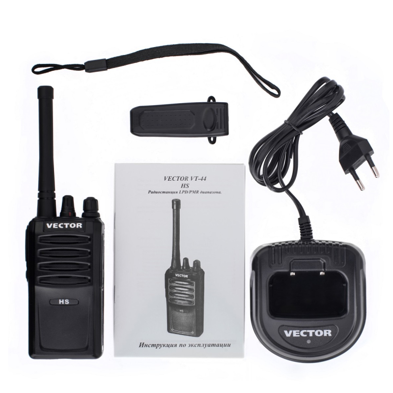 Vector VT-44 HS – рация для работы в UHF диапазоне с безлицензионными LPD и PMR каналами. Максимальная мощность на передачу - 5 Вт. Аккумуляторная литий-ионная батарея на 1500 мАч не требует жесткого соблюдения дисциплины заряда-разряда. В режиме быстрой зарядки прибор заряжается за 3 часа. На боковой панели под клавишей PTT расположена дополнительная кнопка оперативного доступа к одной из возможных настраиваемых функций. Радиостанция выполнена в прочном корпусе из ударопрочного поликарбоната.