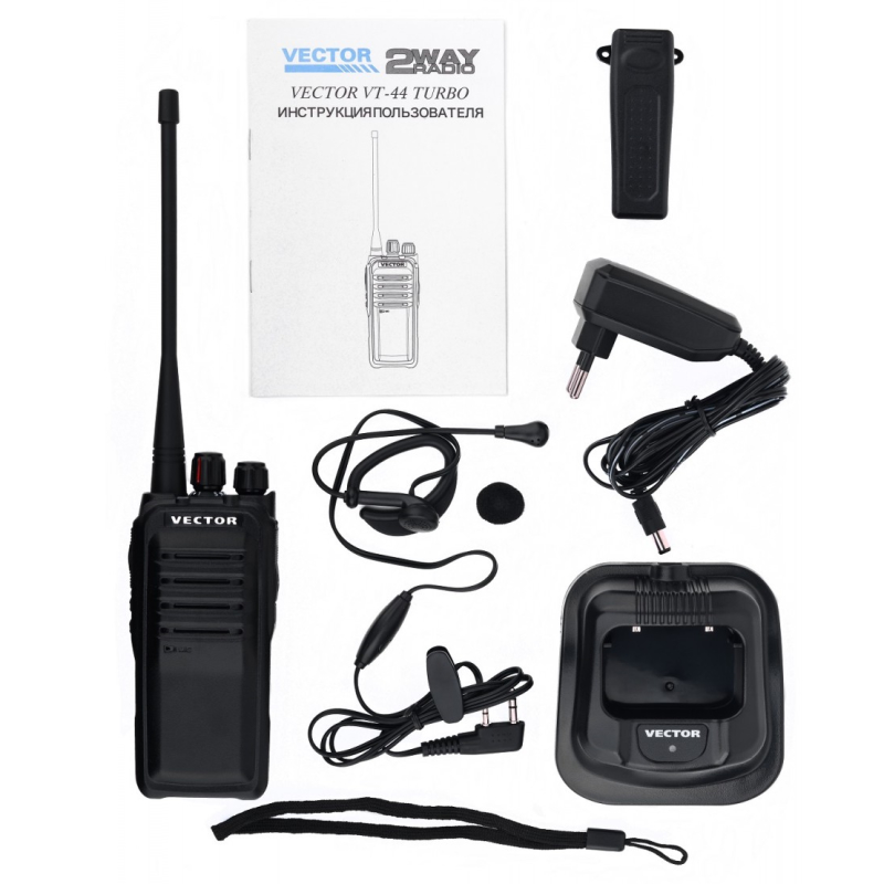 Vector VT-44 Turbo – портативная рация с мощным аккумулятором 3500 мАч. Рабочая полоса частот - 400-520 МГц. Максимальная мощность передатчика достигает значения в 8 Вт, что дает преимущество по дальности связи и пробиваемости в сравнении с большинством аналогов на 5 Вт. Для удобства доступа к функциям, под клавишей PTT расположены 2 дополнительные функциональные кнопки. Регулировка громкости и переключение каналов производятся валкодерами.