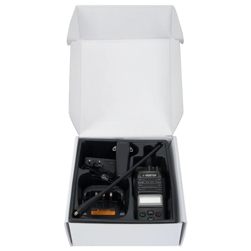 Комплект включает: трансивер Vostok AST-12, антенна AL-12, элемент питания BP-12, зарядная станция BC-12, зажим на ремень CL-12, инструкция, упаковка.