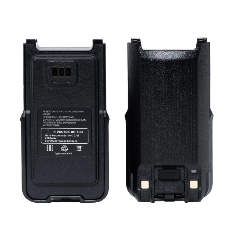 Комплект поставки: приемопередатчик Vostok ST-103, антенна AL-103, элемент питания BP-103, зарядный стакан BC-103, кабель зарядки Type-C, зажим на ремень CL-103, инструкция по применению, упаковка.