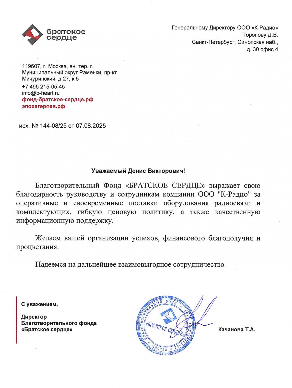 Благотворительный Фонд "Братское сердце" выражает свою благодарность руководству и сотрудникам компании ООО "К-Радио" за оперативные и своевременные поставки оборудования радиосвязи и комплектующих, гибкую ценовую политику, а также качественную информационную поддержку. Желаем вашей организации успехов, финансового благополучия и процветания. Надеемся на дальнейшее взаимовыгодное сотрудничество.