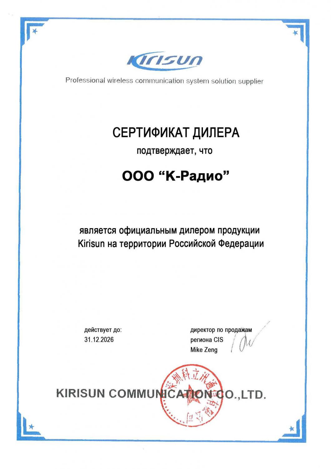 Сертификат дилера подтверждает, что ООО "К-Радио" является официальным дилером продукции Kirisun Communication co.,LTD на территории Российской Федерации.