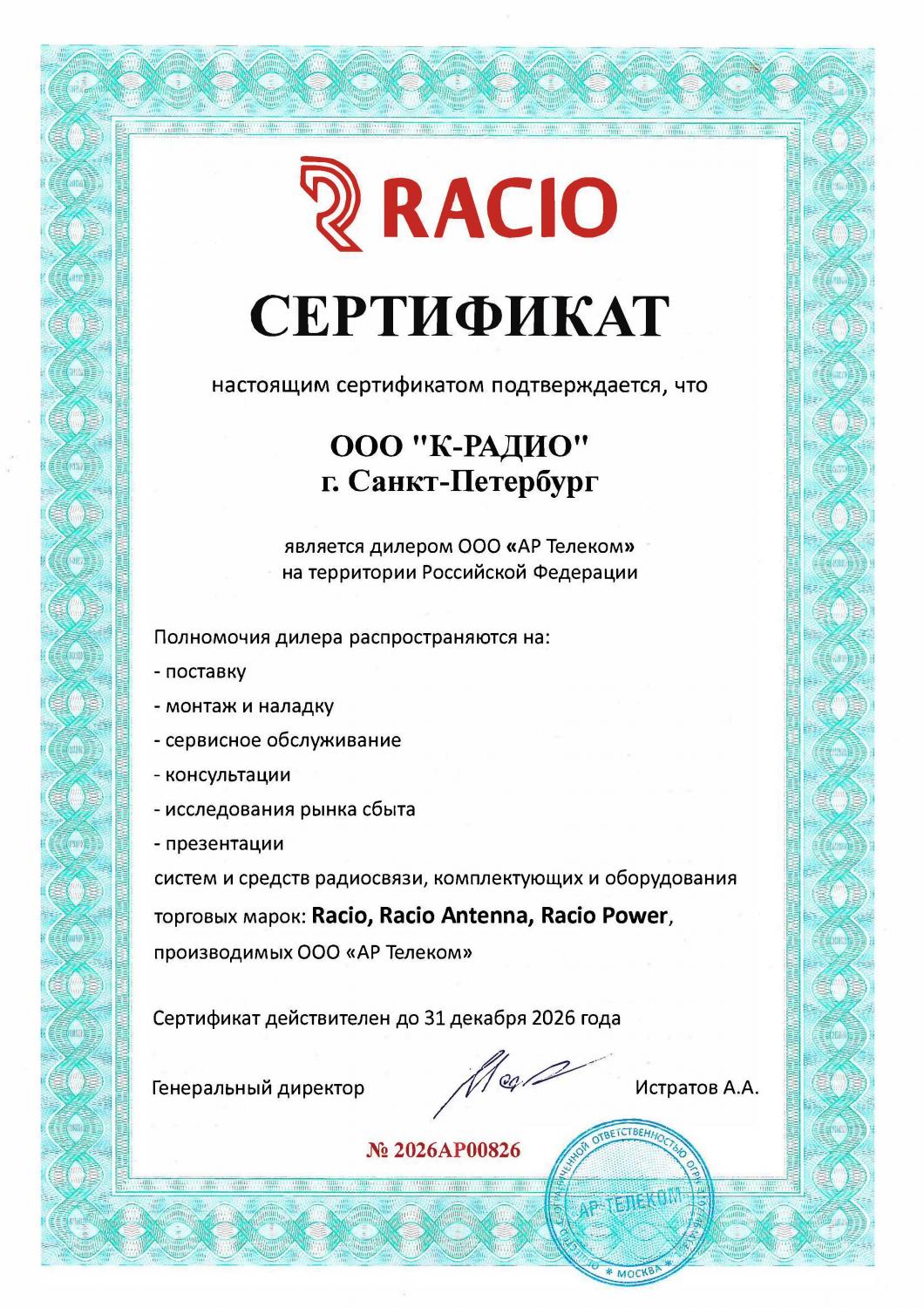 Настоящим сертификатом подтверждается, что ООО "К-Радио" является дилером ООО "АР Телеком" на территории Российской Федерации. Полномочия дилера распространяется на поставку, монтаж и наладку, сервисное обслуживание, консультации, исследование рынка сбыта, презентации систем и средств радиосвязи торговых марок Racio, Racio Antenna, Racio Power, производимых ООО "АР Телеком".